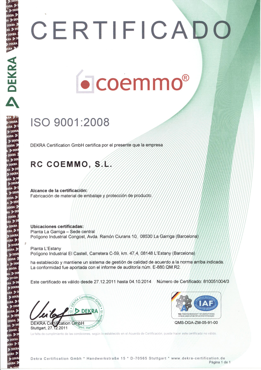 DEKRA CERTIFICATION, certifica que RC COEMMO tiene implantado un sistema de gestión de la calidad de acuerdo con la norma ISO 9001:2008. Con esta filosofía involucramos a proveedores, subcontratistas así como al personal de la empresa en nuestro sistema de calidad, con el fin de dar la mayor satisfacción a nuestros clientes con productos y servicios controlados.